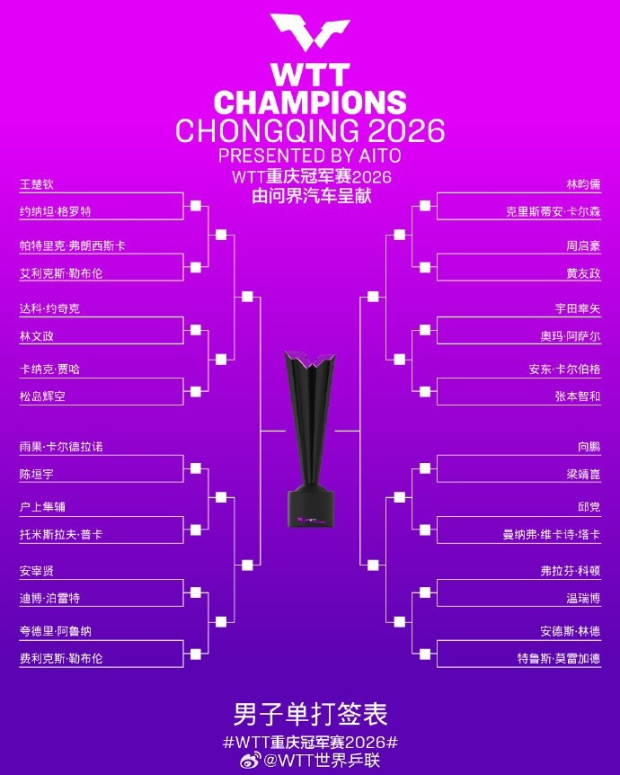 英雄联盟比赛投注 WTT重庆冠军赛男单签表: 王楚钦上半区, 下半区首轮两组国乒内战