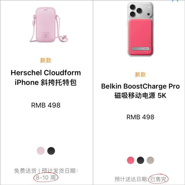 这批新品崇拜发售距今仅几周,但据苹果官网透露,其中两款家具还是卖断货,包括一款斜跨托特包和一款磁吸挪动电源,国行售价均为498元。
