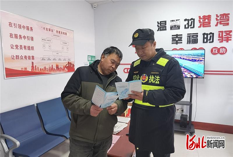 1月23日,邢台市官庄超限检测站工会驿站使命主谈主员为货车司机王师父(左)考验战略。 邢台市交通运载工会供图