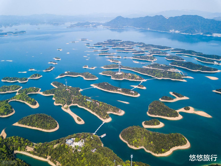 数千个岛屿构成的庐山西海,小岛雷霆万钧,部分小岛之间以栈谈连续。