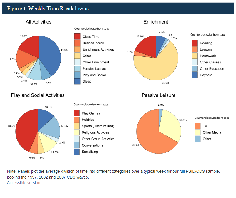 好意思国儿童每周时辰分拨中,寝息和课堂时辰占据绝对主导(分离约占65.8%和40.3%),而解放玩耍与应答行径仅占7.4%。