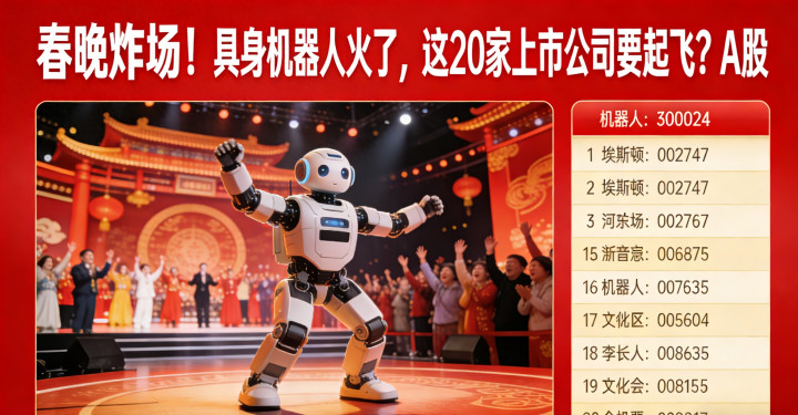 2026年央视春晚的舞台热度还未散去,今年最大的惊喜,不是星光熠熠的明星阵容,而是一群能精准互动、流畅完成高难度动作的“科技新星”——银河通用具身大模型机器人。这群硬核机器人一夜出圈,让观众直呼大开眼界,更让资本市场的目光齐刷刷聚焦到具身智能这条赛道,其背后深度关联的20家A股上市公司,也瞬间成为市场热议的焦点。这波由春晚带火的科技风口,究竟藏着怎样的产业逻辑?这些上市公司又在产业链中占据着怎样的位置?今天就用大白话,把这背后的门道一一讲透。