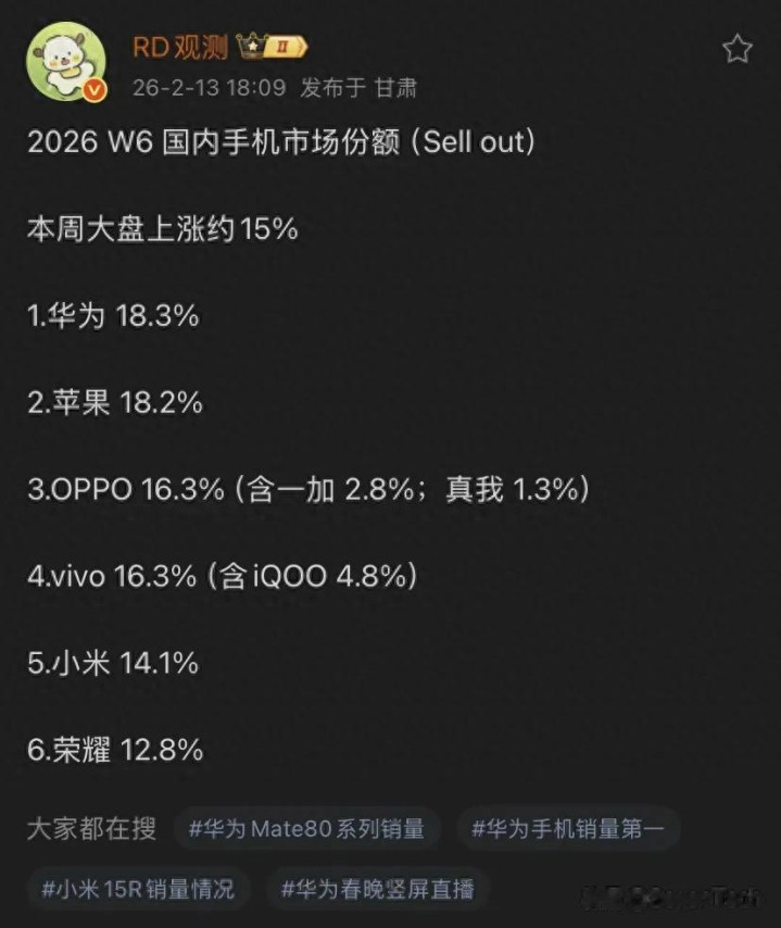 2026年已参预第六周,华为在中国智妙手机销量中持续保握卓越地位,打败了苹果和小米等竞争敌手。这很可能获利于高端Mate 80系列的大领域坐褥。数码博主 RD 不雅测再次发布了2026年第六周中国智妙手机销售市集的分析叙述,华为凭借其苍劲阐扬位居榜首。