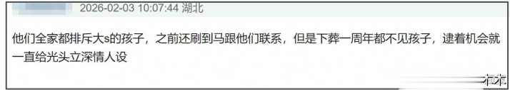 大S下葬时S家就没有通知孩子,现在一周年也没有通知,不止一位网友发现,S家似乎有意无意地将大S子女排除在外,小S和S妈一直口口声声说在乎大S,非常想念她,但对于大S最爱的两个孩子,却没有人提及和在意,亲妈的所有悼念都把孩子完全排除,令人难以理解。