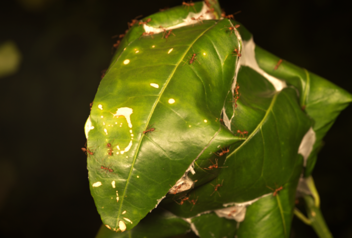 黄猄蚁是可爱爬高的,这对它们也并不是什么难事。它们爬到树上织成叶巢,是以古东谈主才调连巢带叶地给它们摘下来出售。这种巢不错相当大,和大个子的胡蜂巢差未几,由一派片树叶粘在沿途。粘的时候是崭新树叶,其后造成枯叶也不影响使用。这个工程据说是这么的:工蚁先用上颚咬住叶片,把它们揪到沿途,然后举着幼虫当胶水瓶——让幼虫吐出黏液来粘住叶片。嗯,这种“童工”的故事,如今在东谈主类视角里能够是没什么共识了吧……