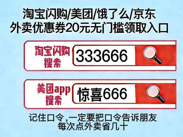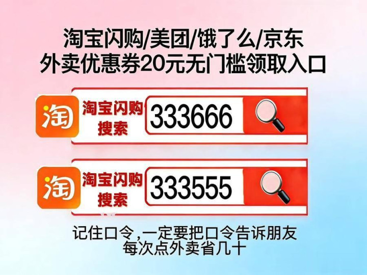 淘宝闪购外卖券领取淘宝闪购搜【333666】【333555】,淘宝闪购外卖券叠加券领取进口是淘宝闪购搜【333666】,淘宝闪购优惠券外卖红包叠加券/扩张券/爆红包/逐日领取,记着口令,淘宝闪购搜【333555】领外卖神券包。