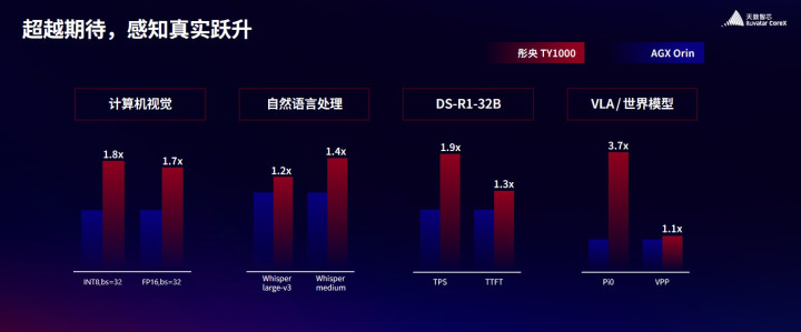 天数智芯方面指出,在计算机视觉、自然语言处理、DeepSeek32B大语言模型、具身智能VLA模型及世界模型等多个场景的实测中,彤央TY1000的性能全面优于英伟达AGXOrin。