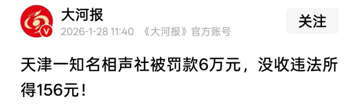 大河报:天津一知名相声社被罚款6万元,没收违法所得156元!