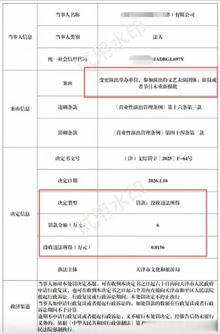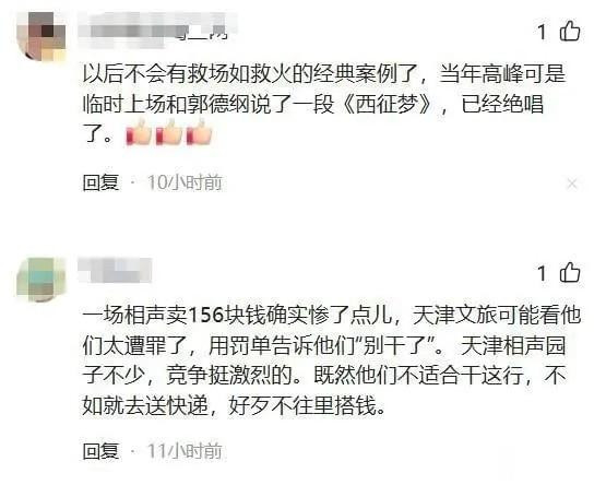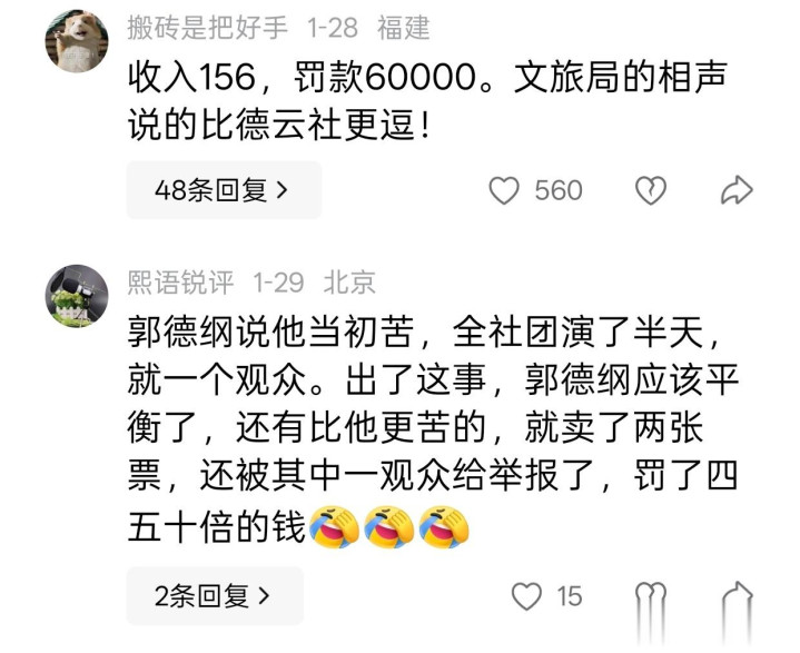 这场演出的规模小到让人意外,全场只有2名观众购票,演出的全部营收只有156元,就是这156元的收入,让钱城的相声社付出了沉重的代价。天津市文旅局依据《营业性演出管理条例》对相声社做出处罚,罚款6万元,同时没收156元的违法所得,156元换6万罚款,这个悬殊的对比,让不少人都直呼意外。