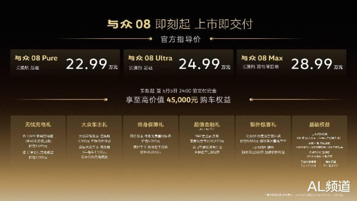 【2026年4月16日,深圳】历经24个月的潜心开采,金标人人旗下首款全时互联全尺寸纯电SUV——与众08负责上市,新车推出了Pure、Ultra、Max共3个版块,官方引诱价为22.99万元-28.99万元。新车推出了丰富的限时职权,即刻起至5月5日24:00前支付定金,即可享至高价值45,000元购车职权。