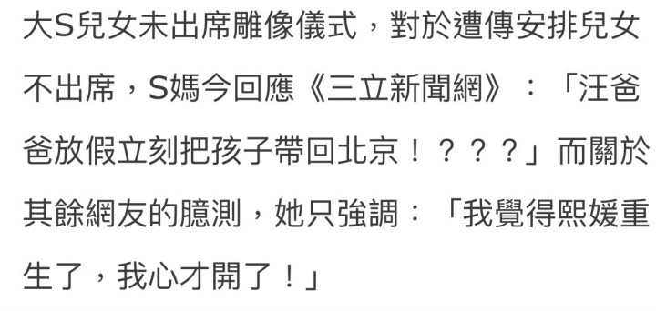 S妈对这类言论很是愤怒,于是她通过媒体回应,她说她从来没有不让2个孩子来参加大S去世一周年仪式,两个孩子缺席说因为一放假就被汪小菲接去北京了,一直在北京没有回来过。