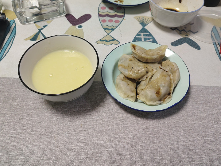 吃了七个蒸饺,喝了点玉米糊,做好了饭,我就和儿子先吃了,早饭吃的时间也早。